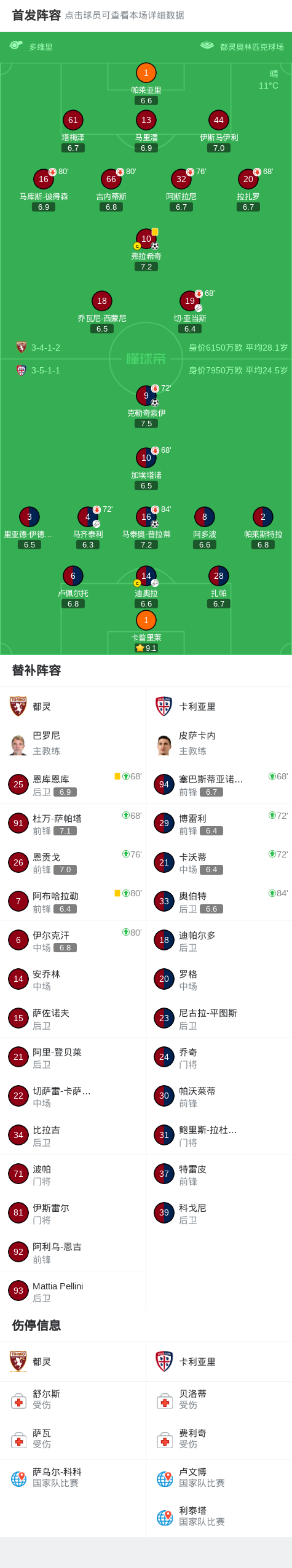 卡利亚里2-1逆转都灵,克勒奇索伊、马泰奥-普拉蒂破门