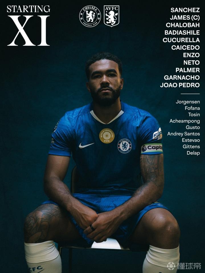 切尔西首发:1-桑切斯、24-詹姆斯、5-巴迪亚西勒、23-查洛巴、3-库库雷利亚、25-凯塞多、8-恩佐、7-内托、10-帕尔默、49-加纳乔、20-佩德罗
