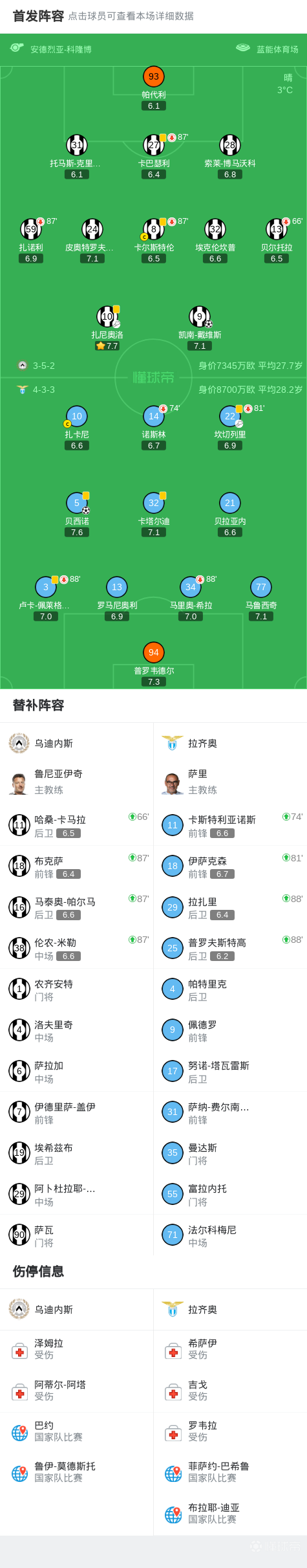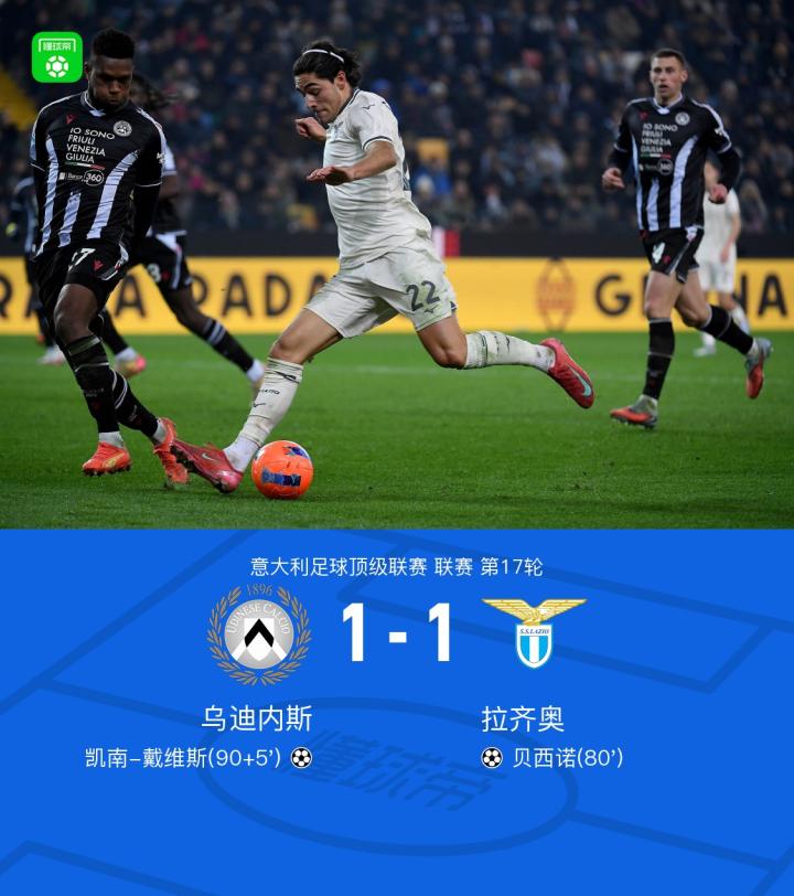 北京时间12月28日,意甲联赛第17轮,乌迪内斯坐镇主场迎战拉齐奥。第80分钟,拉齐奥由贝西诺射门经折射入网。第90+5分钟,乌迪内斯由凯南-戴维斯破门完成绝平。最终,双方以1-1握手言和。