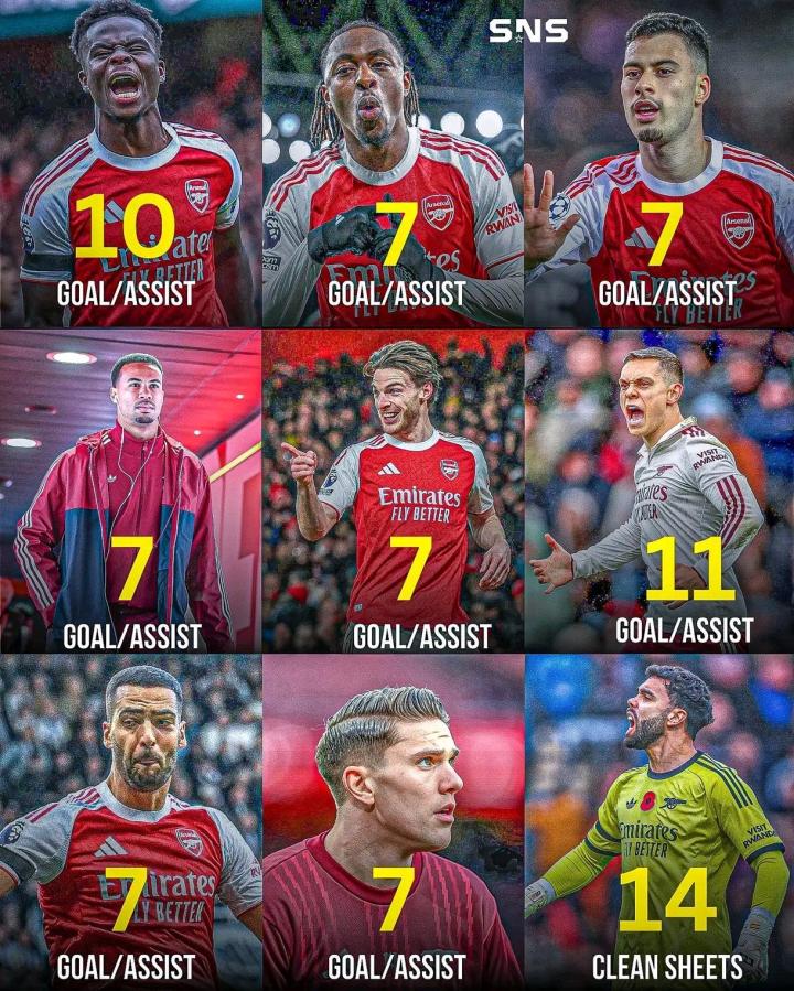 阿森纳的阵容排面!本赛季球队英超已有12名不同球员取得进球