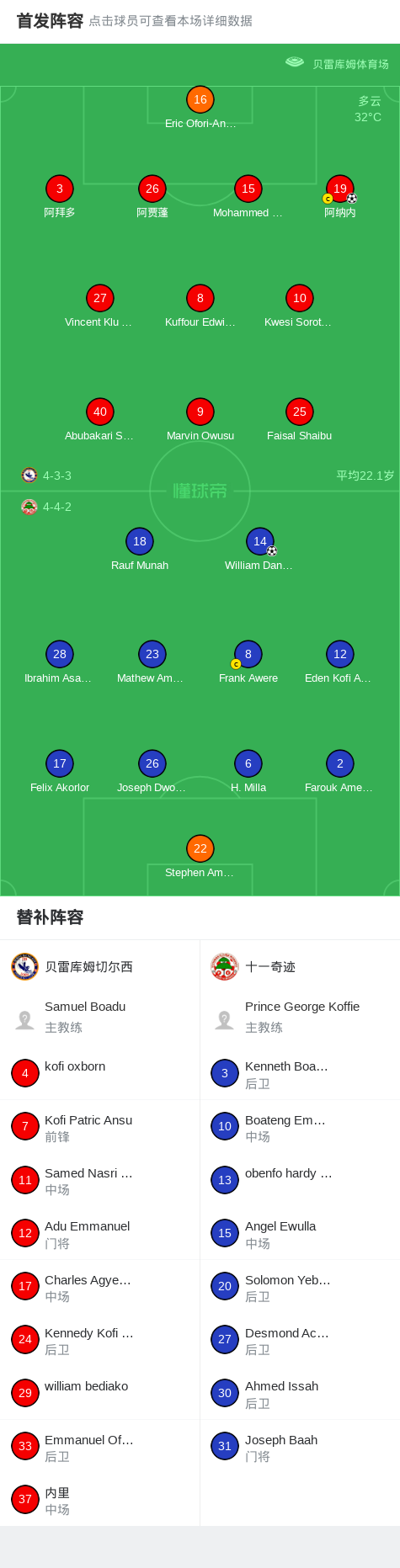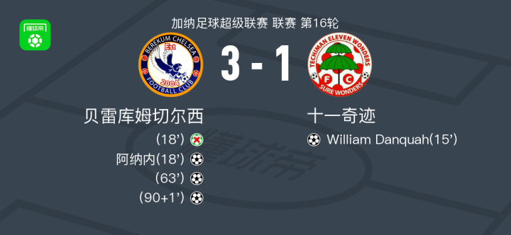 北京时间12月28日加纳足球超级联赛 联赛 第16轮,贝雷库姆切尔西主场对阵十一奇迹。贝雷库姆切尔西阿纳内破门。十一奇迹William Danquah破门。最终比分贝雷库姆切尔西 3-1 十一奇迹。