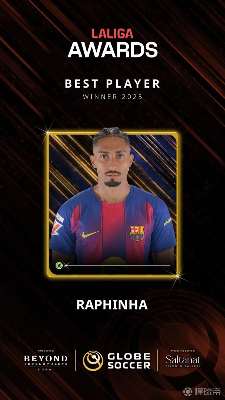 官方:拉菲尼亚获得环球足球奖2025年度西甲最佳球员奖