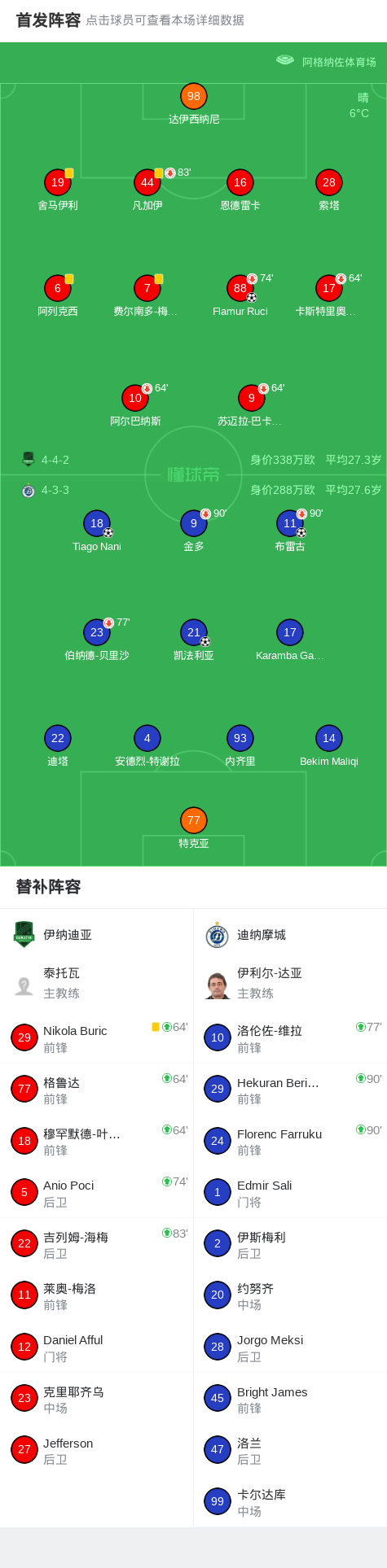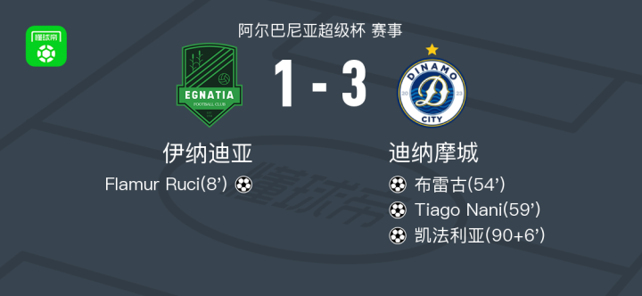 北京时间12月29日,阿尔巴尼亚超级杯展开较量,伊纳迪亚与迪纳摩城展开激烈对决。比赛开局阶段,伊纳迪亚球员Flamur Ruci率先取得进球,为球队建立领先优势。随后,迪纳摩城逐步掌控节奏,并由布雷古扳平比分。不久之后,Tiago Nani接应进攻再度破门,帮助球队实现反超。临近结束前,迪纳摩城持续施压,凯法利亚在补时阶段攻入关键一球,锁定胜局。最终全场结束,比分为伊纳迪亚 1-3 迪纳摩城。