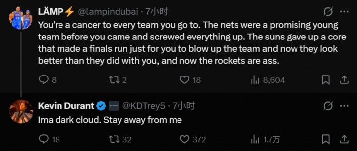 对此,杜兰特光速回复:“我是一片乌云,请离我远点儿”。