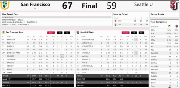 北京时间12月29日美国大学男子篮球联赛 常规赛,西雅图大学对阵旧金山大学。半场西雅图30-32旧金山大学,最终西雅图59-67不敌旧金山大学。