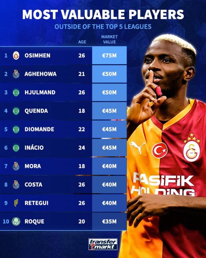 北京时间12月29日,德转列出了非欧洲五大联赛球员身价前10,奥斯梅恩以7500万欧元高居第一,奥莫罗迪翁和莫滕-尤尔曼德5000万欧元并列第二,巴塞罗那旧将维托尔-罗克上榜。