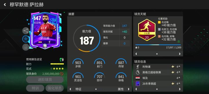 本赛季萨拉赫的状态起伏较大,目前为止,他各项赛事20次出场,打进5球贡献4助攻。冬季英超活动中,萨拉赫的全新球员卡配备了小火箭天赋,花式方面,高级油炸丸子搭配四星花式星级确保了他的边路突破能力。