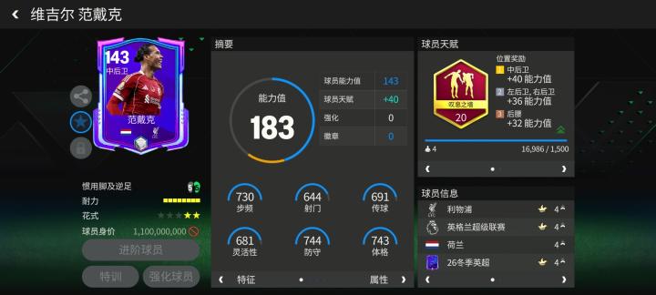 尽管近年来随着年龄的增长,范戴克的状态有一定下滑,但他依旧是利物浦防线的核心。游戏中,冬季英超范戴克配备了叹息之墙天赋,对他的防守端关键数据提升显著,中等+高的攻守效率也确保了他的防守存在感。
