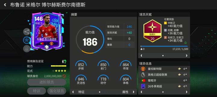 B费是曼联的队长,本赛季他各项赛事出场18次,已经贡献了5球7助攻。游戏中,他在冬季英超活动推出的球员卡配备了指南针天赋,马赛回旋基础花式,而高达10格的耐力配置,能让他比赛中长时间保持稳定发挥。