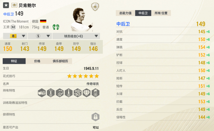 时刻贝肯鲍尔的定位虽是中后卫,但放在后腰更好,是公认的第一后腰。贝皇的身体对抗强、扫荡防守积极;还有着媲美前锋的进攻能力,超远距离起脚都能取得进球;55脚左右开弓,传球调度不在话下。