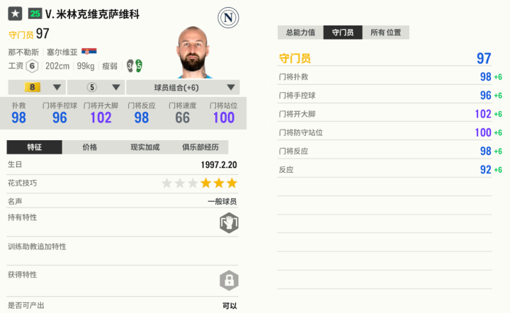 这张卡在25LIVE赛季更新后,工资涨了1点,但是对其强度没有影响,依旧还是最稳的。比起其他低工资门将,米林的扑救稳定性更高,下地反应更快、脱手次数更少,最值得相信。