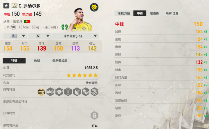 如果在游戏里找一个中锋,把速度、对抗、头球、远射、劲射、传球、跑位、拿球都做到极致,那有且只有传奇永恒C罗能做到。他不需要考量版本,他就是版本,只要上场就能进球,很朴实无华,也很不讲道理。