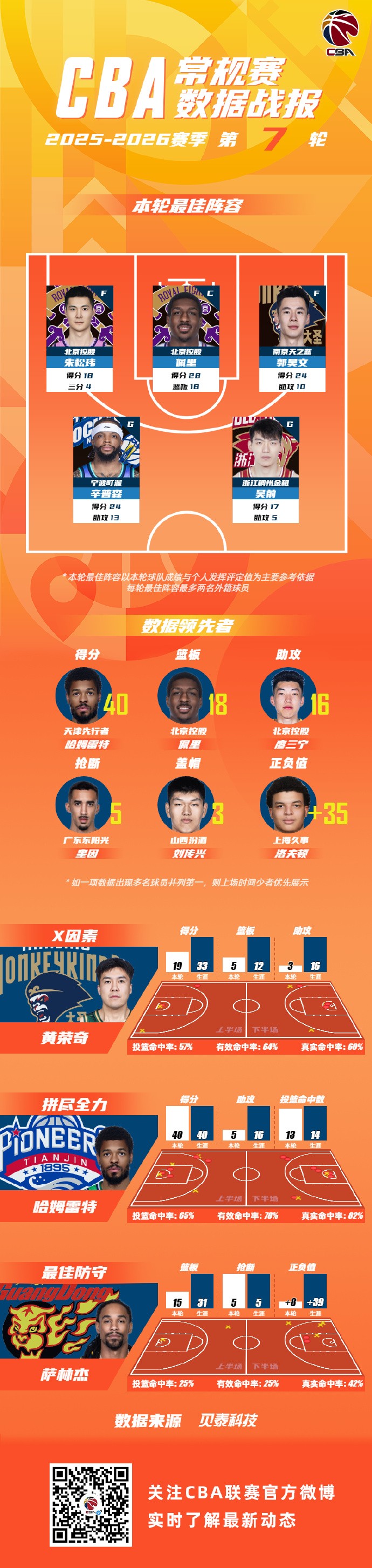 天津荣钢球员哈姆雷特以单场40分的数据领衔得分榜;