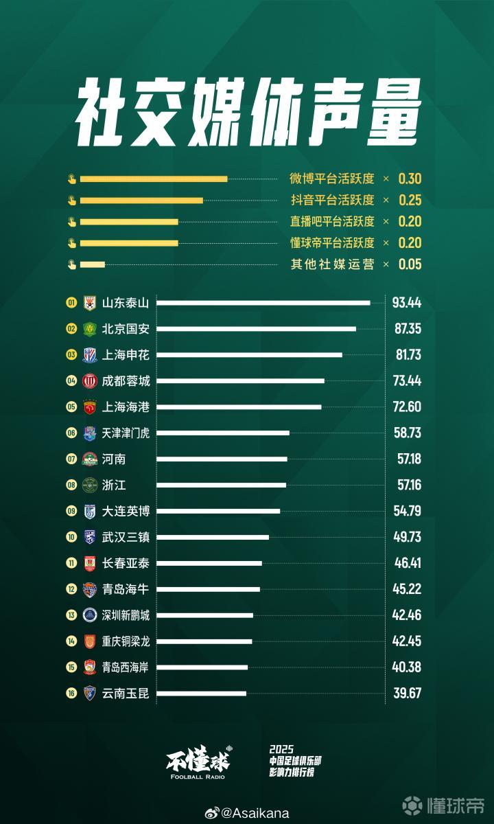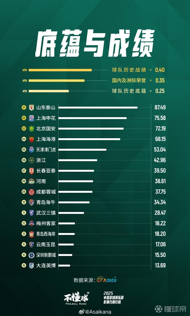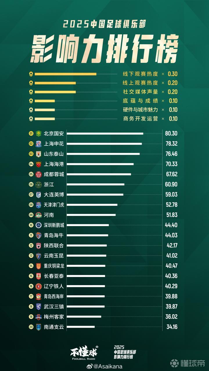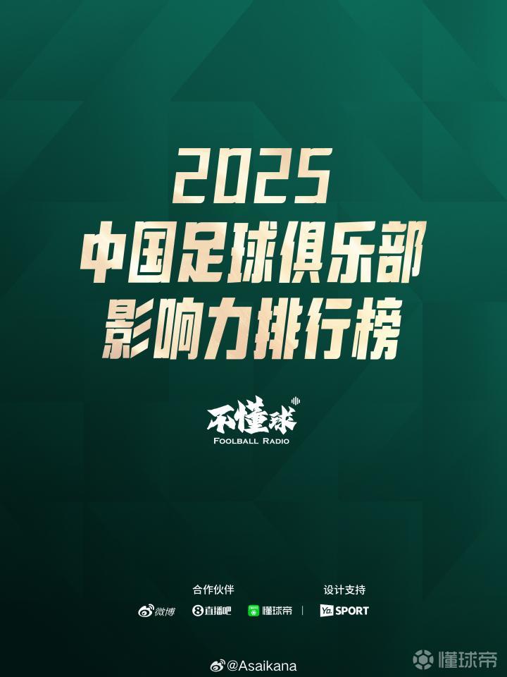 不懂球发布了「2025年中国足球俱乐部影响力排行榜」