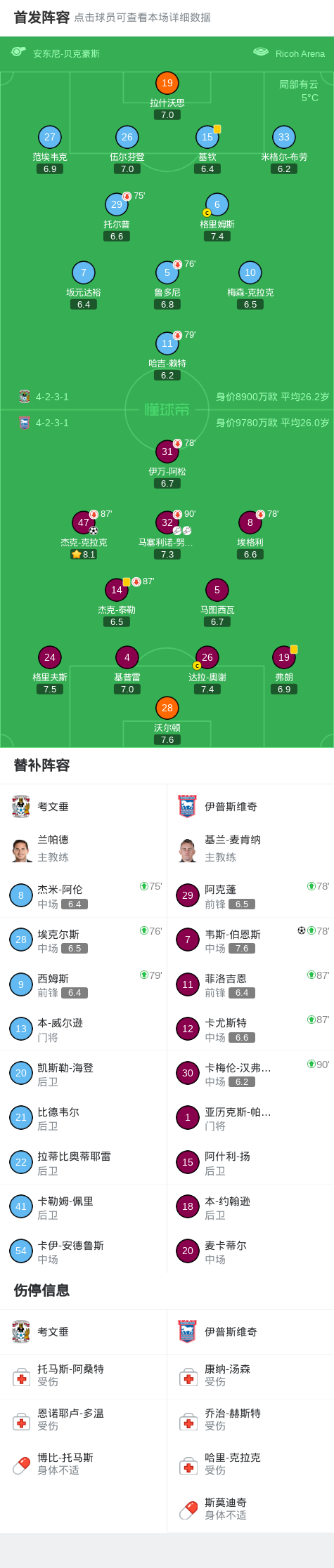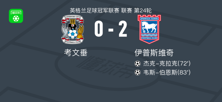 北京时间12月30日英格兰足球冠军联赛 联赛 第24轮,考文垂主场对阵伊普斯维奇。伊普斯维奇杰克-克拉克破门,韦斯-伯恩斯破门。最终比分考文垂 0-2 伊普斯维奇。