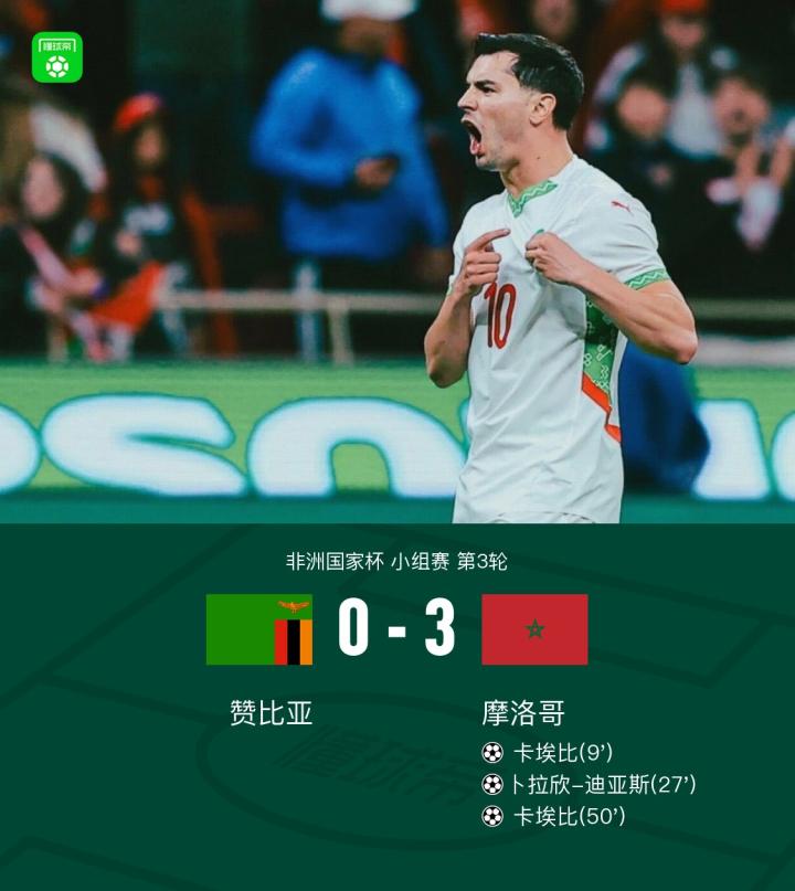 北京时间12月30日非洲国家杯小组赛第3轮,赞比亚对阵摩洛哥。比赛开始后不久,摩洛哥开出战术角球,卡埃比头球破门。随后,阿布德横传,卜拉欣-迪亚斯推射破门将比分扩大。进入下半场,摩洛哥通过任意球机会由欧纳希助攻卡埃比倒挂金钩破门。最终全场结束,摩洛哥3-0赞比亚小组头名晋级。