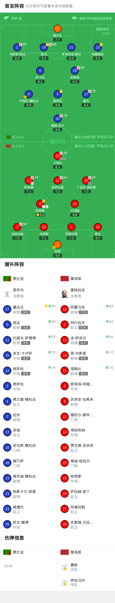 第51分钟,摩洛哥开出任意球,卡埃比无人盯防倒挂金钩破门!摩洛哥3-0