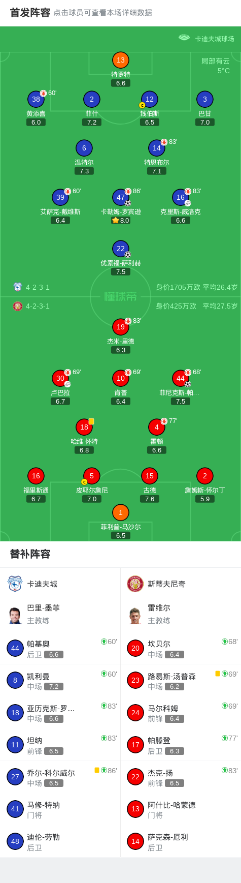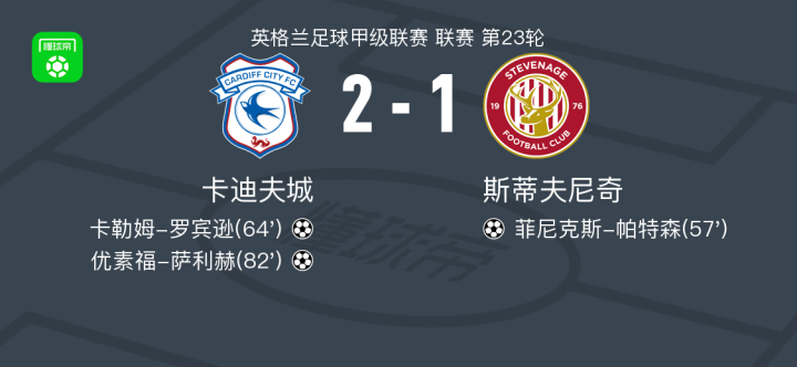 卡迪夫城2-1逆转斯蒂夫尼奇,优素福-萨利赫破门,卡勒姆-罗宾逊建功