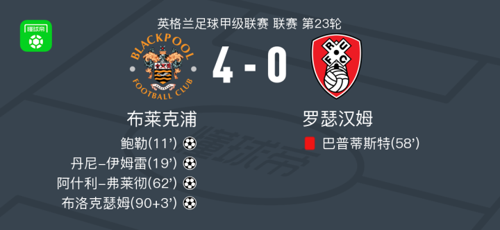 布莱克浦4-0大胜罗瑟汉姆,布洛克瑟姆传射,阿什利-弗莱彻1射1传
