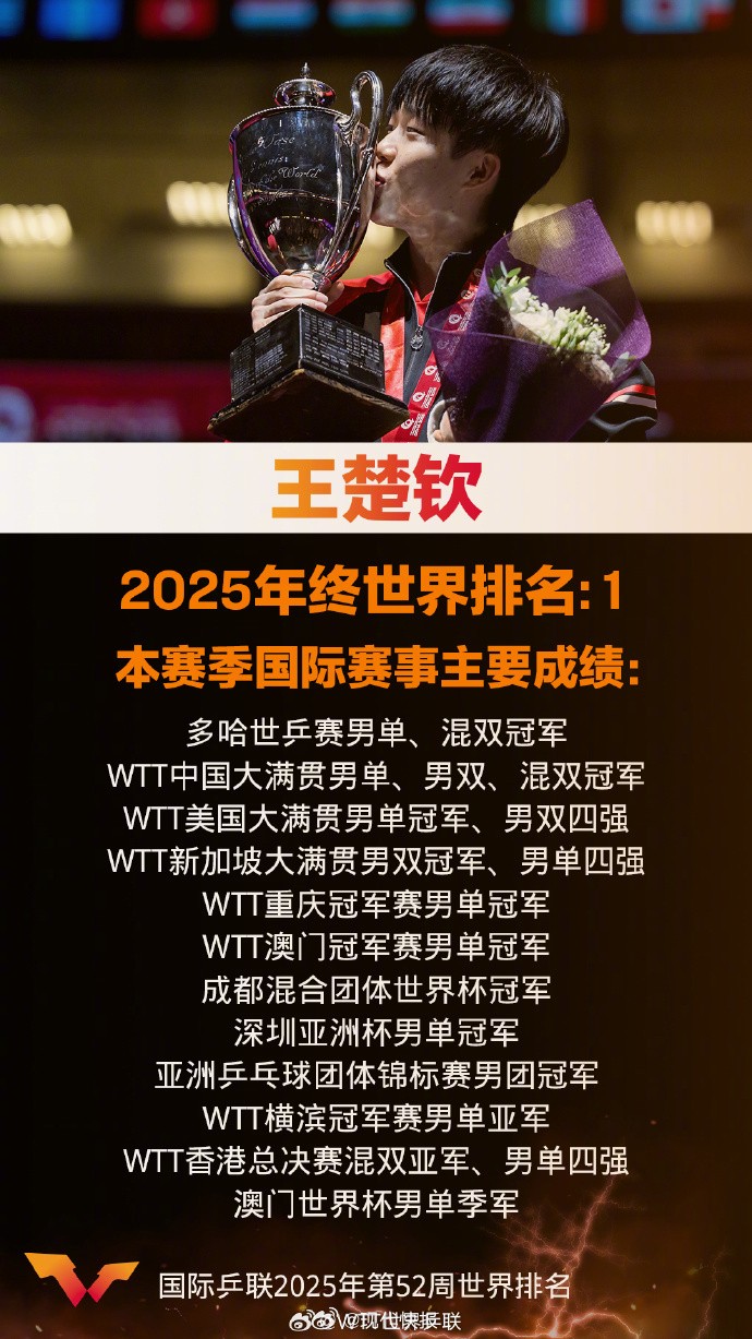 WTT世界乒联写道:“世界排名第一,年终积分9925分。🏆🏆🏆🏆🏆🏆问鼎多哈,破界不止;冠冕加身,初心如刃。回顾2025赛季,你对他印象最深刻的一场比赛是:_____”