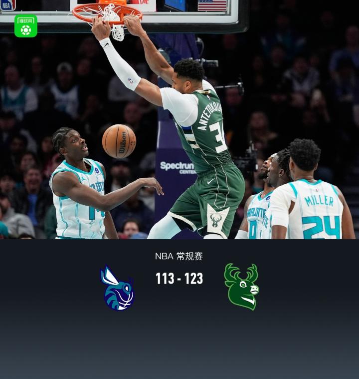 第四节黄蜂拉梅洛-鲍尔拿下10分,雄鹿字母哥拿下11分,最终黄蜂113-123不敌雄鹿