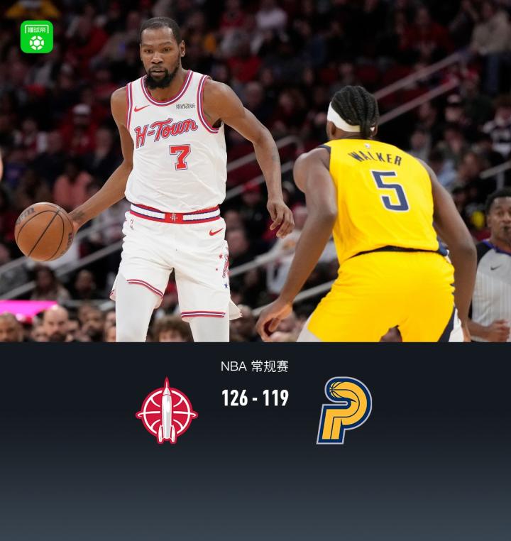 火箭126-119送步行者九连败,杜兰特30+6+5,小贾21+10