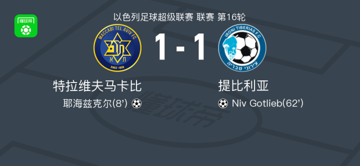 特拉维夫马卡比1-1提比利亚,耶海兹克尔先拔头筹,Niv Gotlieb扳平比分