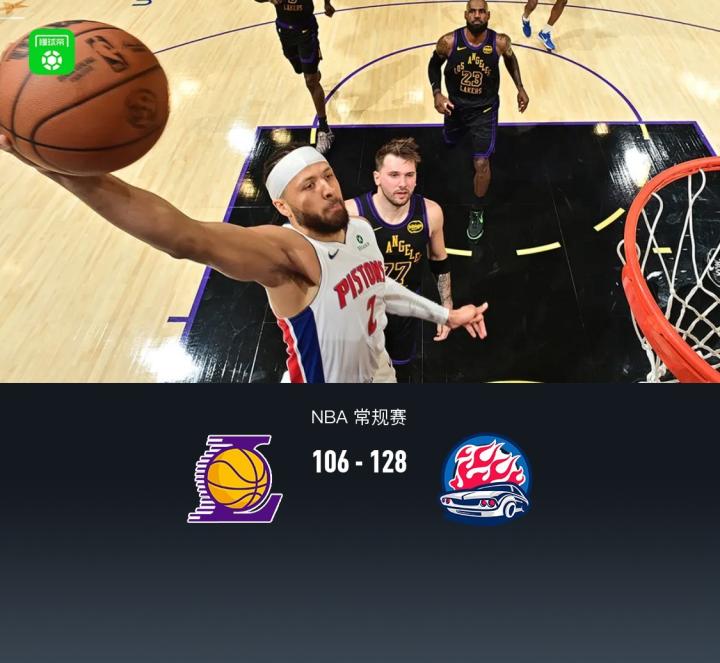 第四节,湖人进攻依旧低迷,随后詹姆斯、东契奇接连失误,活塞持续反击节中便领先20分,随后双方逐渐换下主力,最终湖人106-128不敌活塞。