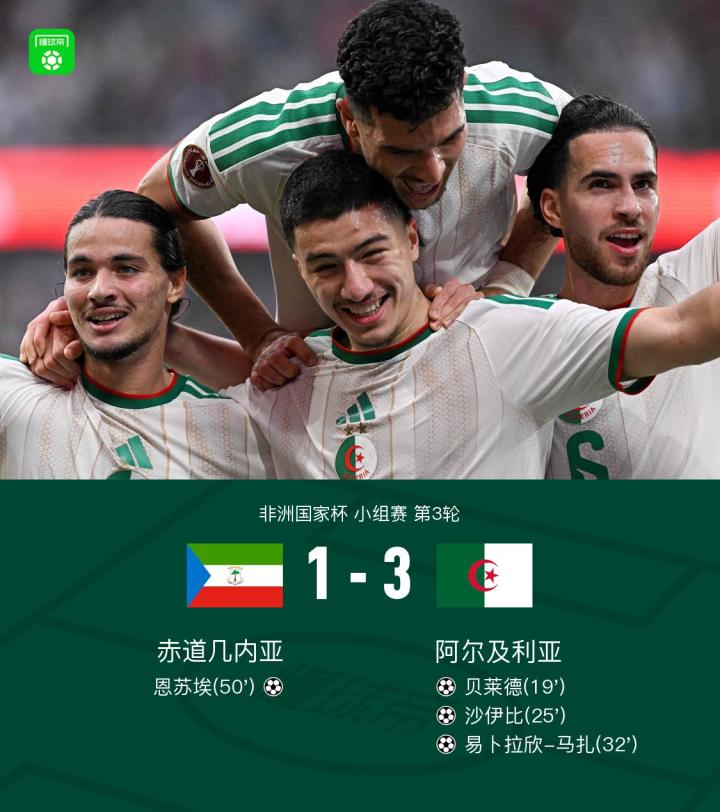 北京时间1月1日非洲国家杯 小组赛 第3轮,赤道几内亚对阵阿尔及利亚。阿尔及利亚队由贝莱德、沙伊比、易卜拉欣-马扎建功,阿尼斯-穆萨两次助攻,恩苏埃下半场为赤道几内亚扳回一城。最终,阿尔及利亚3-1完胜赤道几内亚,三战全胜小组头名出线,赤道几内亚积0分垫底出局。1/8决赛,阿尔及利亚将对阵民主刚果。