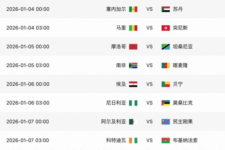 北京时间1月1日凌晨,2026年非洲杯小组赛阶段的比赛全部结束。东道主摩洛哥将对阵坦桑尼亚,阿尔及利亚直面民主刚果,南非与喀麦隆迎强强对话。