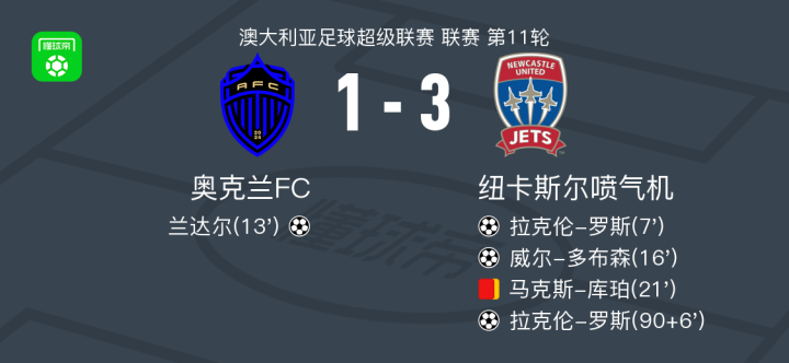 北京时间1月1日澳大利亚足球超级联赛 联赛 第11轮,奥克兰FC主场对阵纽卡斯尔喷气机。奥克兰FC兰达尔破门。纽卡斯尔喷气机拉克伦-罗斯梅开二度,威尔-多布森破门。最终比分奥克兰FC 1-3 纽卡斯尔喷气机。