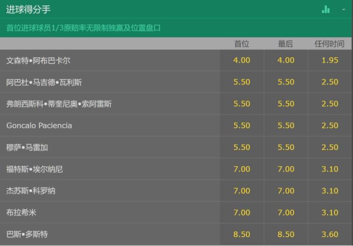 本场进球得分手方面,阿布巴卡尔领跑进球赔率榜,瓦里斯以2.50的数据紧随其后,而多斯特则以3.6的赔率数据排在第9位。