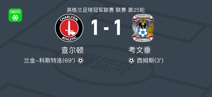 北京时间1月1日英格兰足球冠军联赛 联赛 第25轮,查尔顿主场对阵考文垂。查尔顿兰金-科斯特洛破门。考文垂西姆斯破门。最终比分查尔顿 1-1 考文垂。
