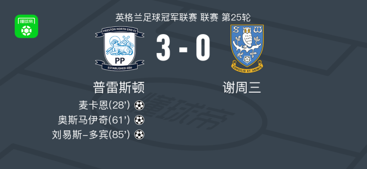 普雷斯顿3-0大胜谢周三,刘易斯-多宾、奥斯马伊奇破门