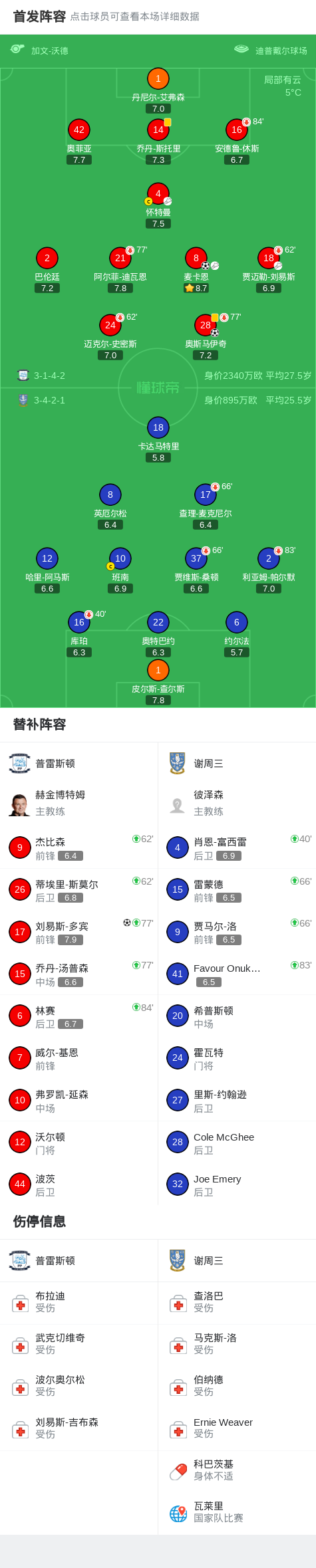 第85分钟,普雷斯顿球员麦卡恩助攻刘易斯-多宾打入一球。