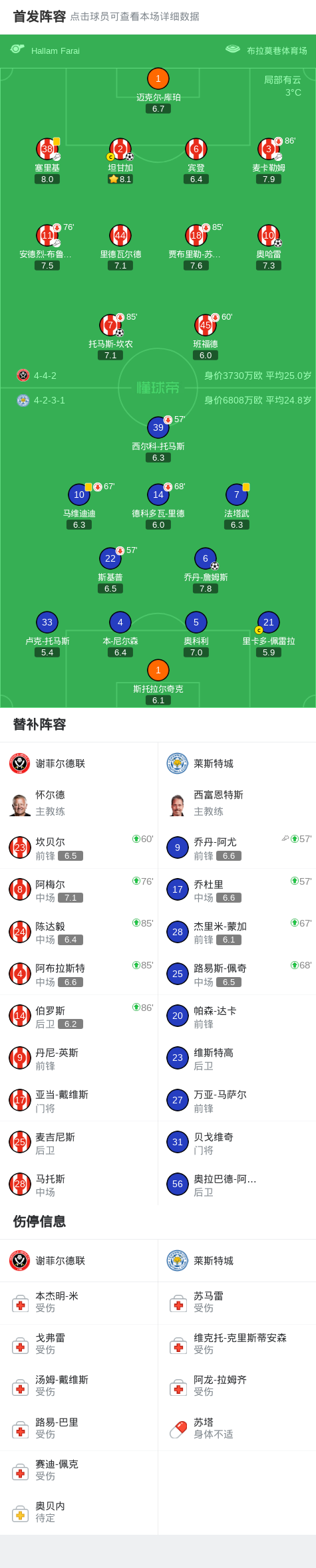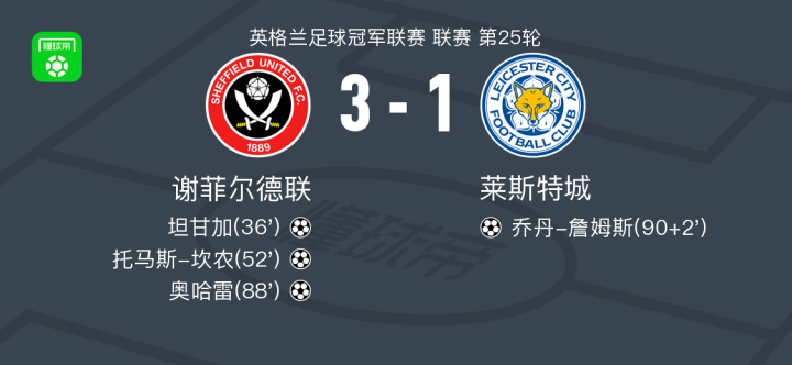 北京时间1月2日英格兰足球冠军联赛 联赛 第25轮,谢菲尔德联主场对阵莱斯特城。谢菲尔德联坦甘加破门,托马斯-坎农破门,奥哈雷破门。莱斯特城乔丹-詹姆斯破门。最终比分谢菲尔德联 3-1 莱斯特城。