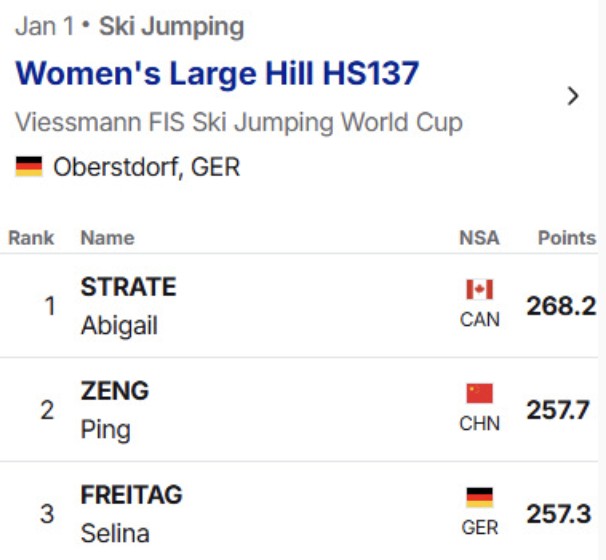 创造历史!曾坪夺跳台滑雪世界杯女子大跳台亚军,实现中国队奖牌零的突破沉默的聒噪 @懂球帝01-02 18:35北京时间1月2日,中国运动员曾坪在国际雪联跳台滑雪世界杯德国奥伯斯多夫站比赛中,以两轮总分257.7分的成绩获得银牌,实现中国队在该项目国际A类赛事中奖牌零的突破。2025-26赛季跳台滑雪世界杯,加拿大选手斯特拉特268.2分,生涯首次获得世界杯跳台滑雪冠军。曾坪击败赢了普雷夫茨,弗赖塔格,丸山希等一众名将获得亚军,这是中国选手首次获得该项目的世界杯奖牌。展开更多