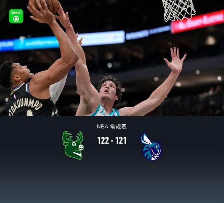 第四节,开节雄鹿波蒂斯连续得分追近比分,但黄蜂塞克斯顿、布里奇斯、克努佩尔接连三分再度拉大至8分,紧跟雄鹿波蒂斯连续两记三分联手字母哥一波8-0追平,后半节黄蜂依靠鲍尔、克努佩尔保持4分领先,最后2分钟雄鹿字母哥持续冲框,随后罗林斯、库兹马相继三分反超2分,还剩最后10秒,黄蜂布里奇斯2+1反超1分,回来雄鹿波特助飞字母哥空接扣篮准绝杀,最后4.7秒黄蜂米勒不中,最终雄鹿122-121战胜黄蜂