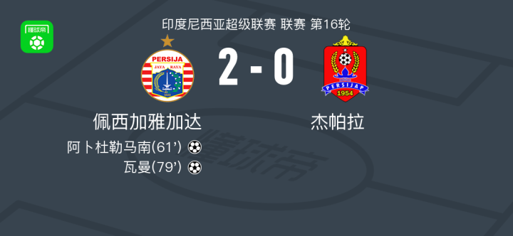 北京时间1月3日印度尼西亚超级联赛 联赛 第16轮,佩西加雅加达主场对阵杰帕拉。佩西加雅加达阿卜杜勒马南破门,瓦曼破门。最终比分佩西加雅加达 2-0 杰帕拉。