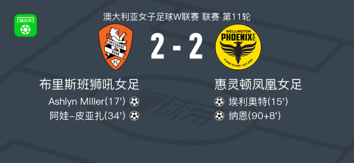 布里斯班狮吼女足2-2惠灵顿凤凰女足,埃利奥特破门,纳恩救主