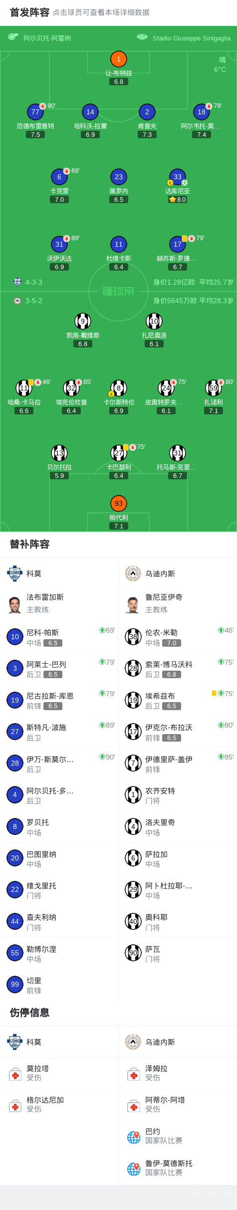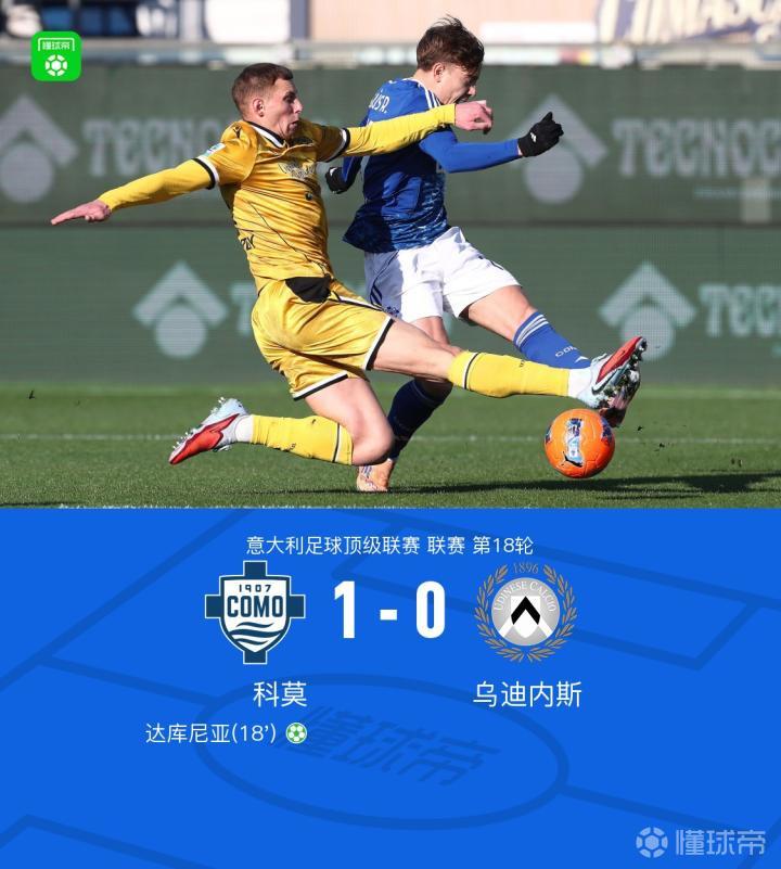 科莫1-0乌迪内斯,达库尼亚点射,扎尼奥洛进球无效