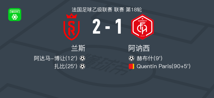 北京时间1月4日法国足球乙级联赛 联赛 第18轮,兰斯主场对阵阿讷西。兰斯阿达马-博让破门,扎比破门。阿讷西赫布什破门。最终比分兰斯 2-1 阿讷西。