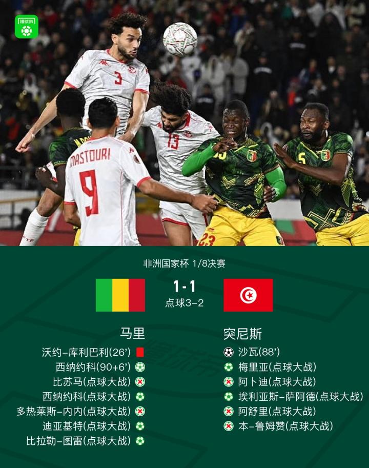 北京时间1月4日,非洲杯1/8决赛,马里对阵突尼斯。比赛中,沃约-库利巴利踩踏被直红罚下,马里少一人作战,沙瓦第88分钟打破僵局,西纳约科补时第6分钟点射绝平。加时赛双方均无建树。点球大战中,吉吉-迪亚拉发挥神勇两扑点,助马里4-3点杀突尼斯,晋级非洲杯8强。