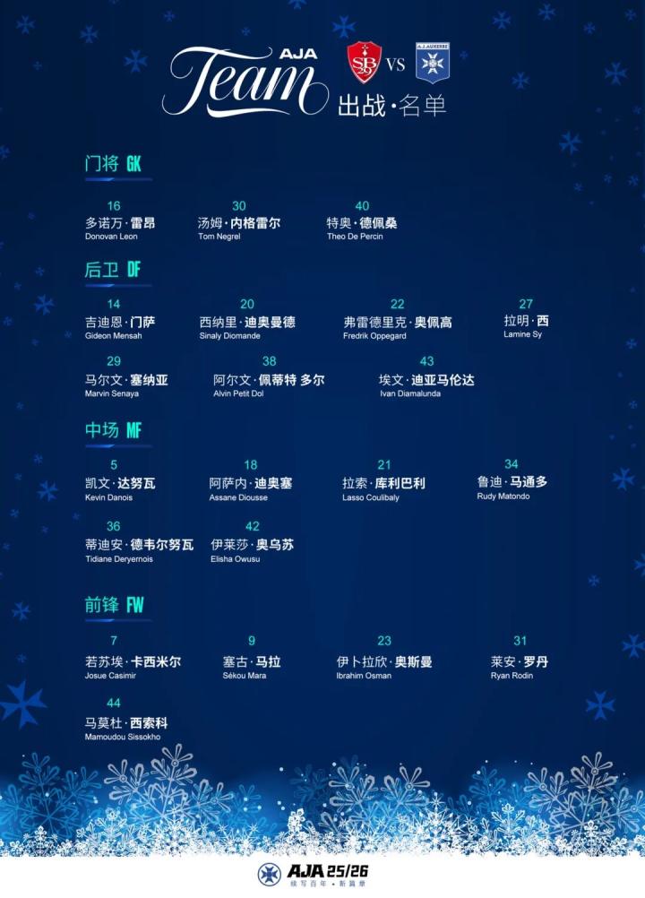 本场半程收官战,欧塞尔的阵容迎来多重调整,机遇与挑战并存。锋线层面,西纳约科、纳马索随国家队出征非洲杯,二人已合计为球队打入8球,是队内最稳定的火力点。他们的缺席无疑将考验球队的锋线深度,佩利西耶不得不进行全新的锋线组合。
