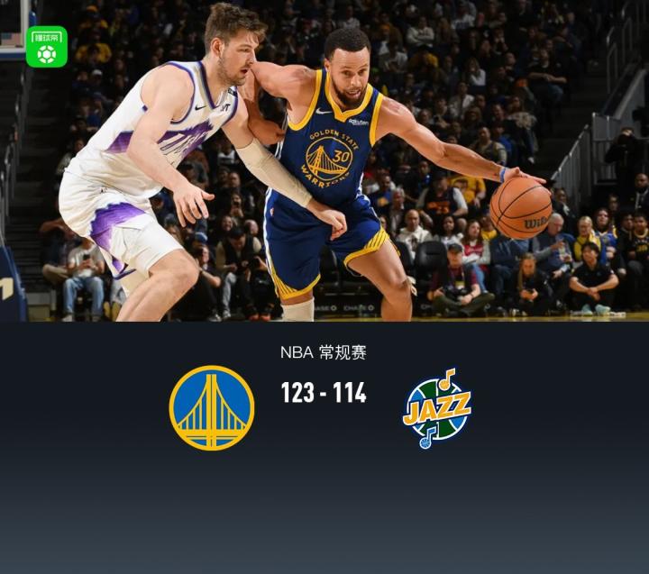 北京时间1月4日NBA 常规赛,金州勇士对阵犹他爵士。上半场勇士一度落后12分,随着次节后半段格林两次技术犯规被驱逐,勇士扭转局面展开追分,半场勇士58-65爵士,第三节勇士库里20分带队42-31反超比分,末节勇士迅速建立两位数领先,随后双方陷入防守拉锯战,最终勇士123-114爵士。
