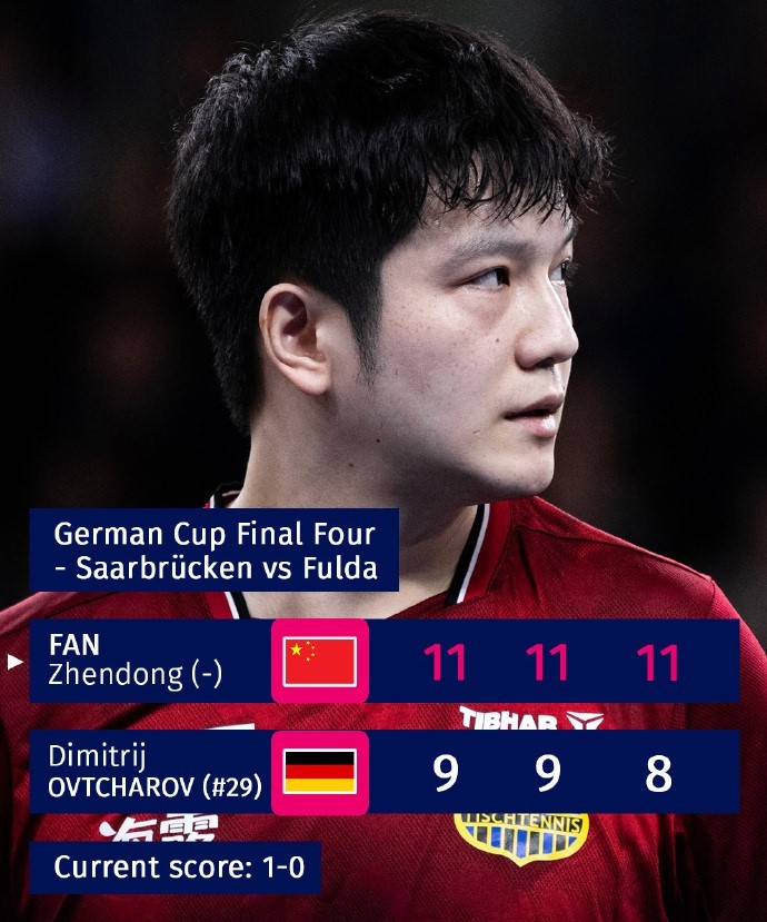 乒乓球德国杯决赛:樊振东3-0奥恰洛夫,萨尔布吕肯1-0领先gaoniu @懂球帝01-04 23:361月4日,乒乓球德国杯决赛,萨尔布吕肯VS富尔达,率先出战的樊振东3-0战胜奥恰洛夫(11-9、11-9、11-8),萨尔布吕肯总分1-0领先。具体对阵第一盘:樊振东vs奥恰洛夫第二盘:弗朗西斯卡vs菲鲁斯第三盘:约奇克vs孟凡博第四盘:樊振东vs菲鲁斯展开更多