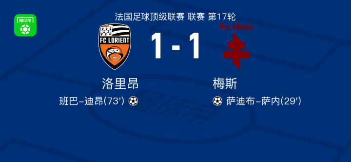 北京时间1月5日,法国足球甲级联赛第17轮,洛里昂坐镇主场迎战梅斯。比赛中,梅斯率先打破僵局,艾因送出助攻,萨迪布-萨内接球后冷静施射得手。随后,洛里昂展开反击,穆罕默德-班巴送出关键传球,班巴-迪昂把握机会完成破门,帮助球队扳平比分。此后双方均未能再度改写比分,最终全场结束,洛里昂与梅斯以1比1握手言和。