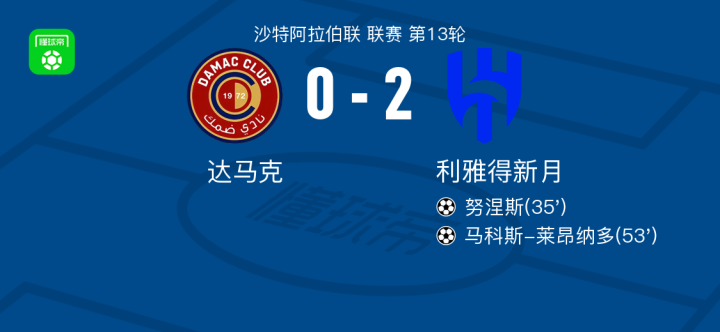 利雅得新月2-0达马克,努涅斯破门,马科斯-莱昂纳多锁定胜局