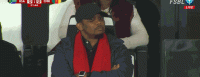 第30分钟,镜头给到场边,埃托奥看台观战