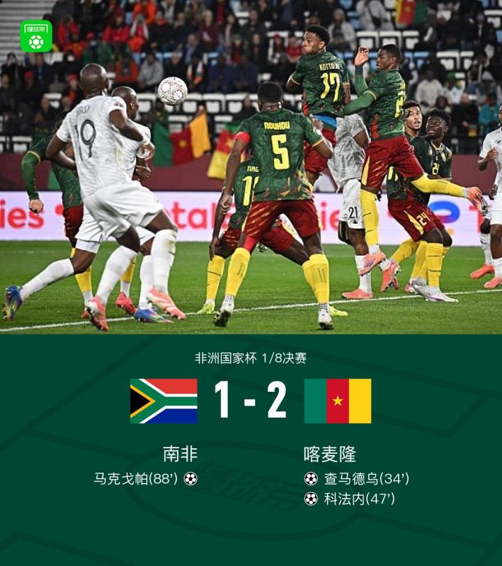 非洲杯喀麦隆2-1南非晋级8强,科法内破门,查马德乌建功